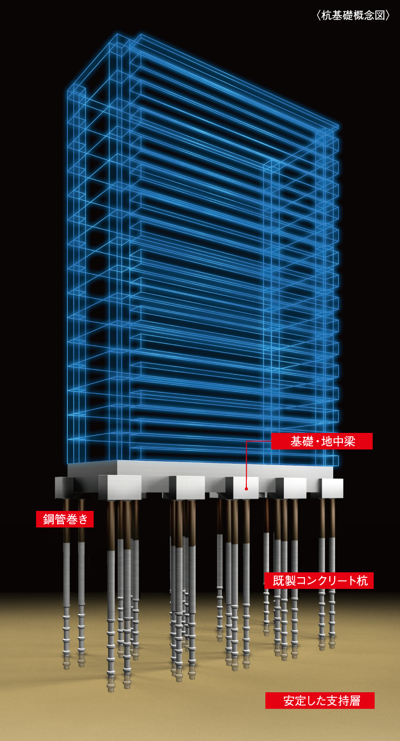 商業施設や物流拠点など、様々な建築物を「下から」支える仕事を通じて、正確かつ確実な社会の土台づくりを行っています。